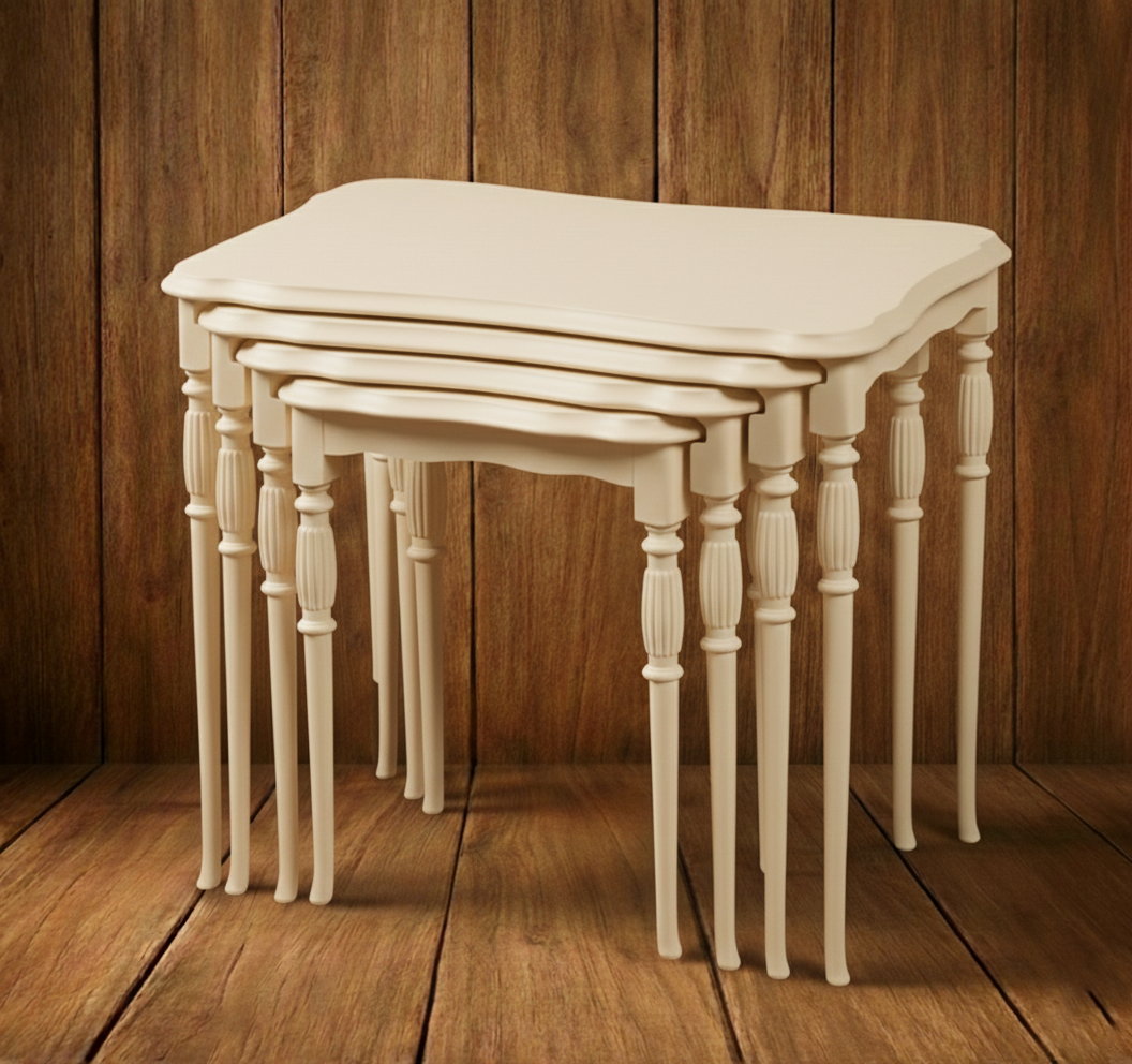 Görseldeki en belirgin imza, ayağın gövdeye bağlandığı noktadaki “dilimli/kavun dilimi” formundaki oyma detaydır. Bu boğumlu yapı, sehpanın bacaklarını bir sütun zarafetiyle aşağı indirir. Üst tablanın kenarlarındaki yumuşak dalgalar, ürünün feminen ve romantik karakterini tamamlar.